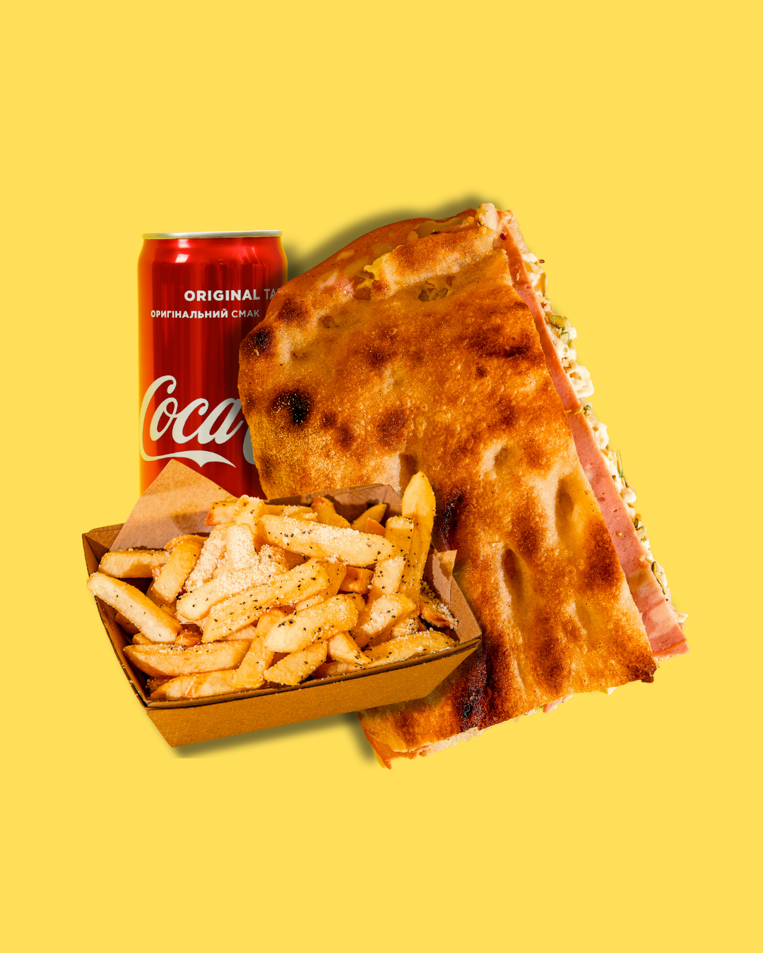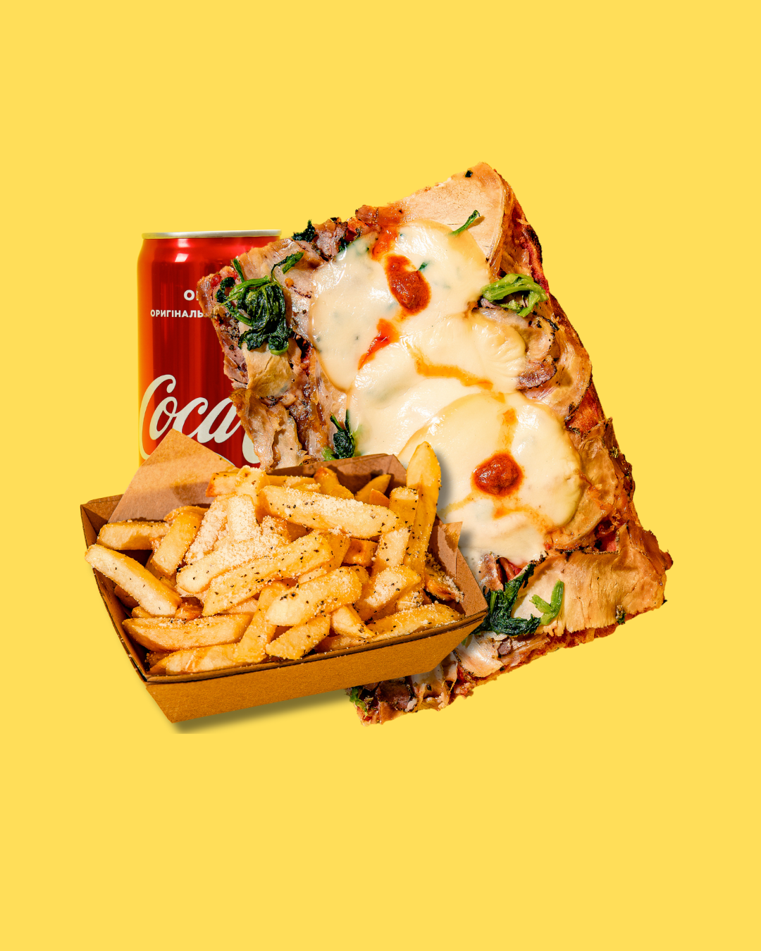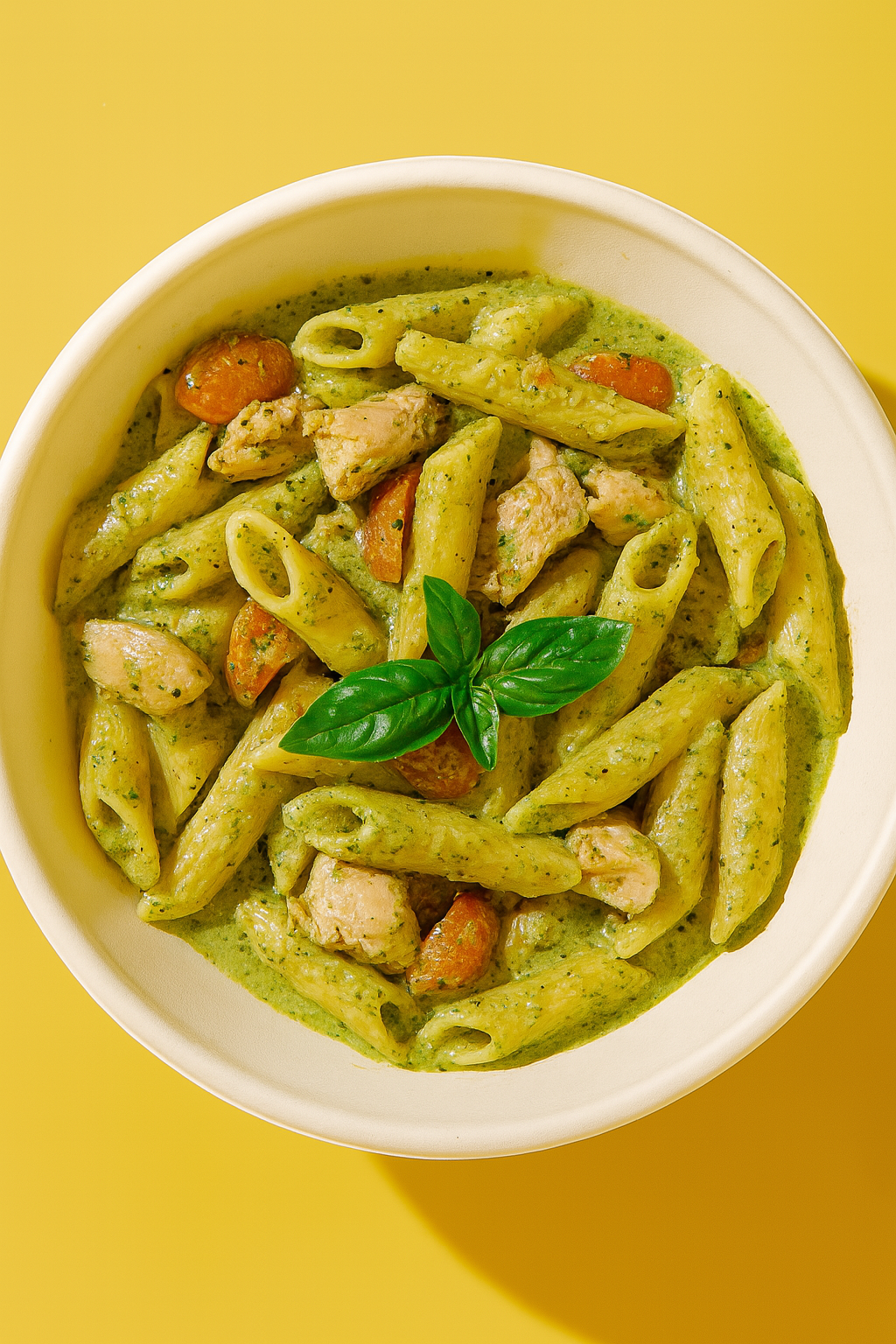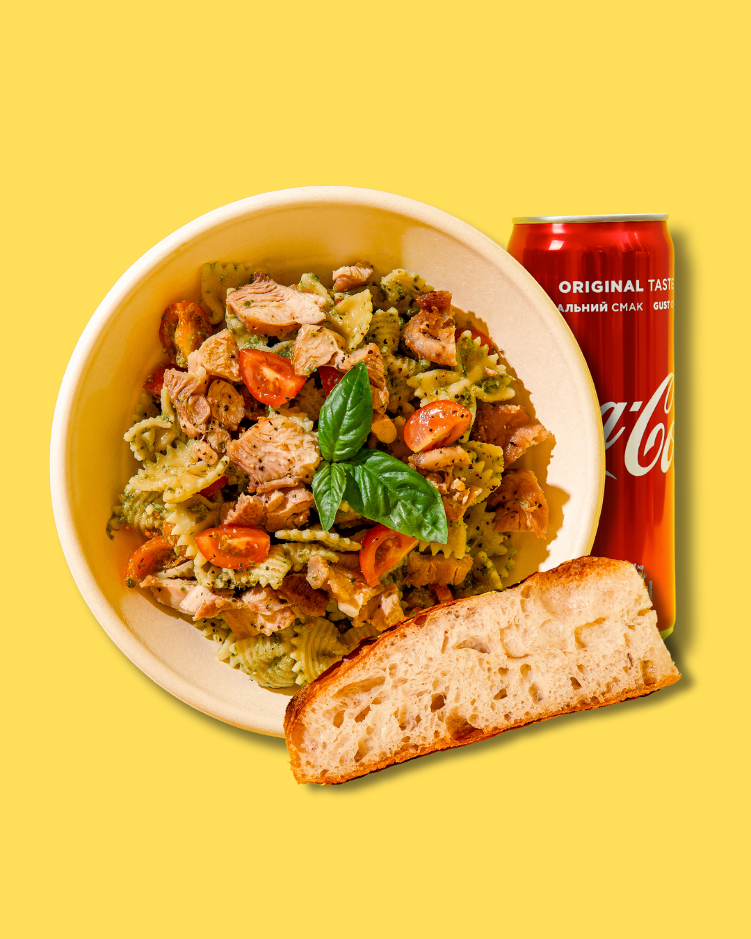 Pesto & Chicken, Focaccia Slice, Drink (penne, pesto, chicken, cream, cherry toms)