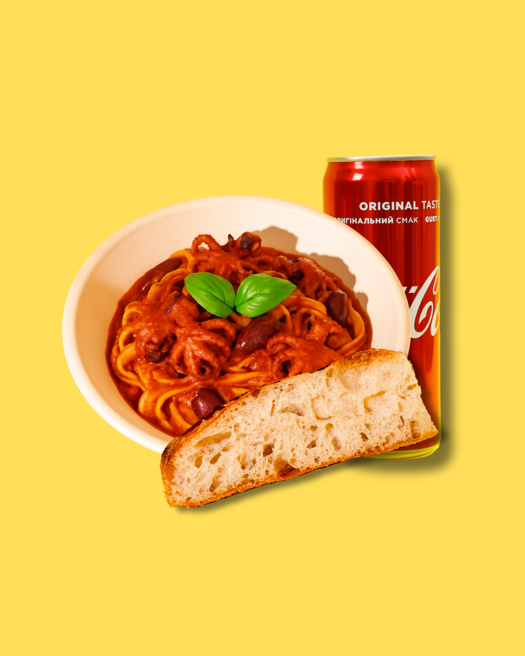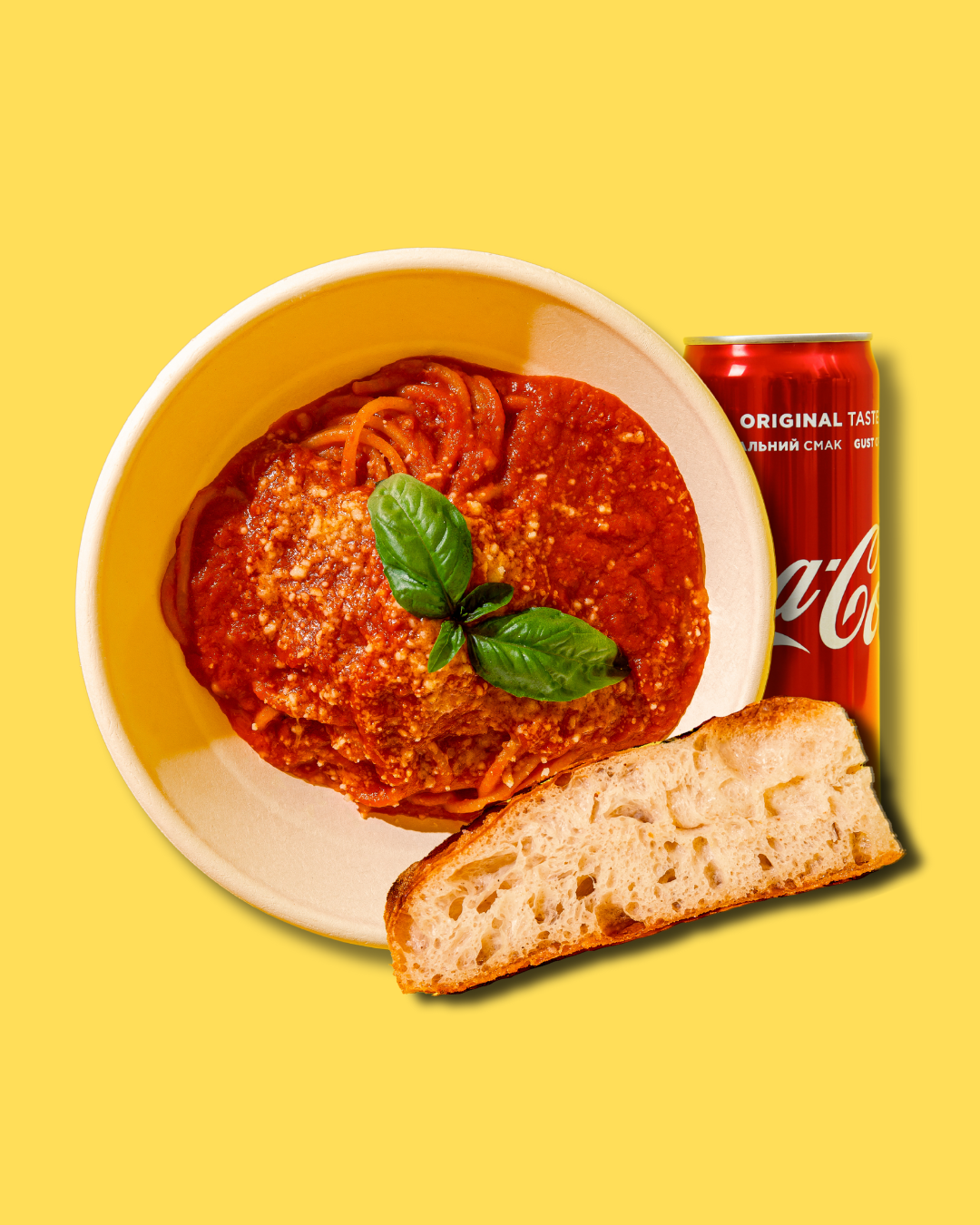 Napoli Pasta, focaccia slice & drink. (Vegetarian) (Spaghetti, napoli sauce, parmesan)