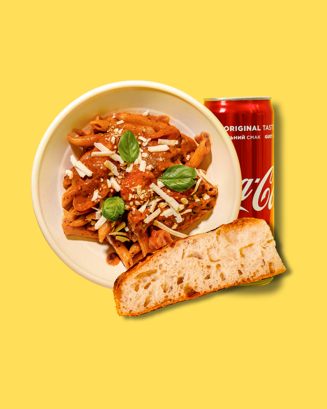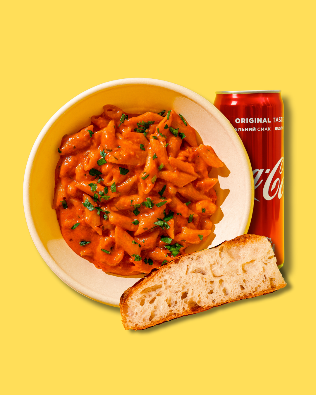 Gamberi & Vodka, focaccia slice, Drink (penne, prawns, vodka, cream, napoli sauce.)