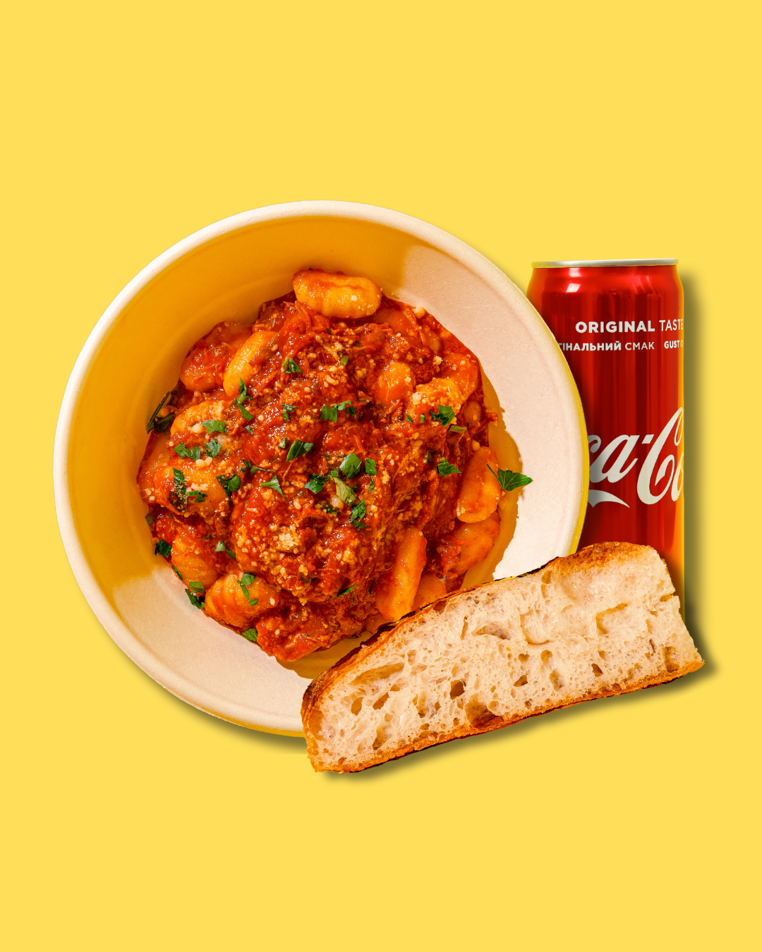 Duck Ragu, focaccia slice & drink. (Gnocchi, lamb ragu, pecorino sauce)